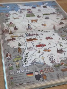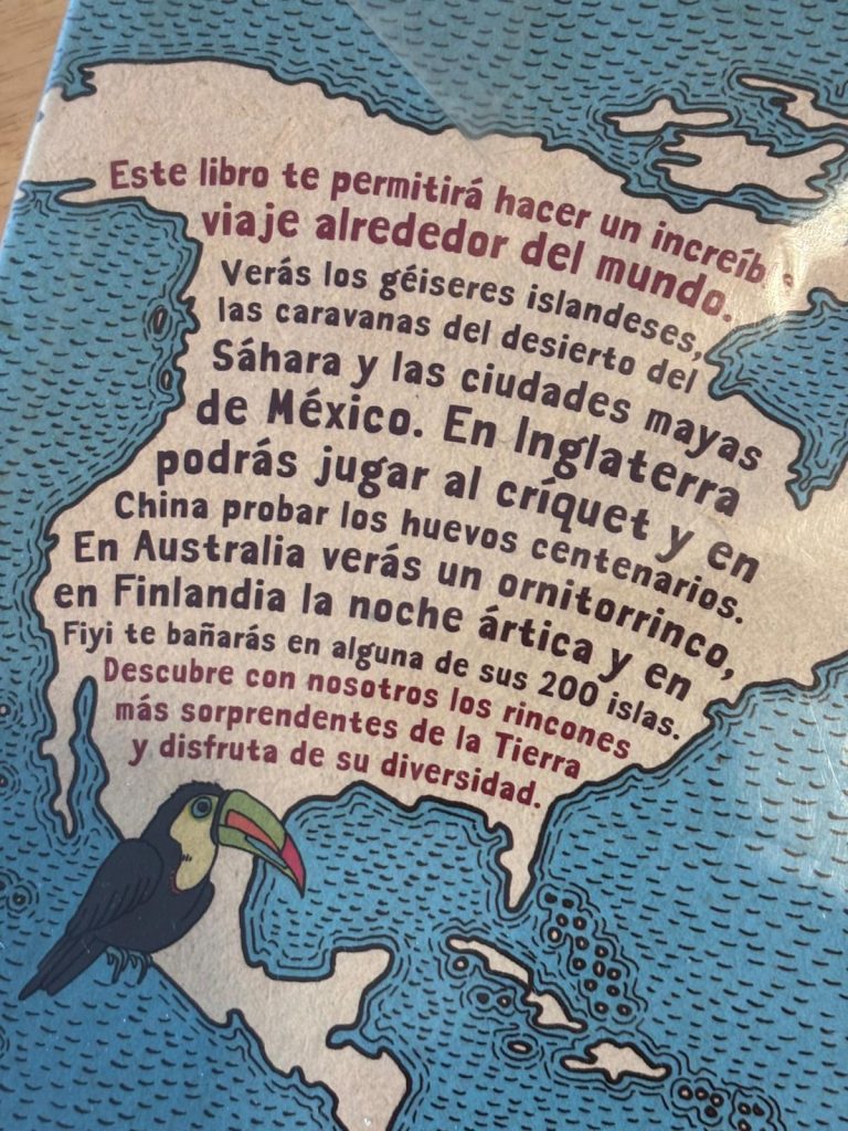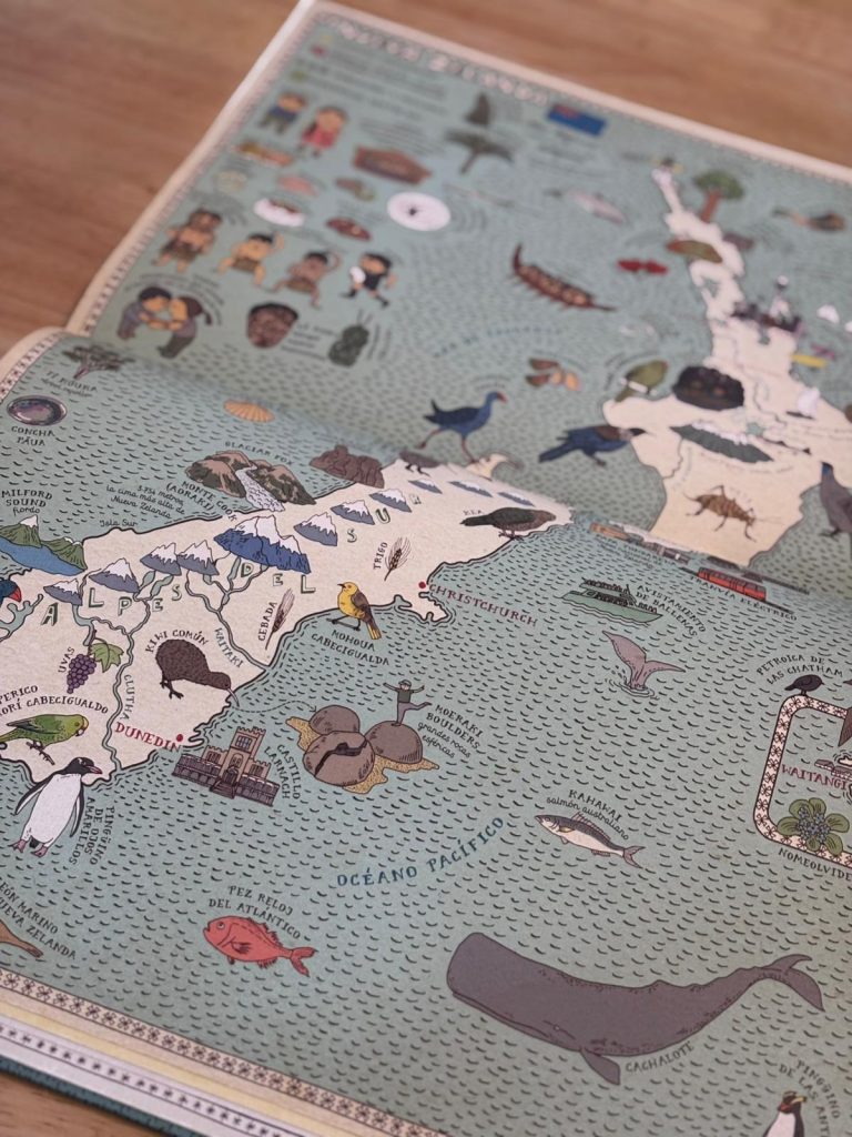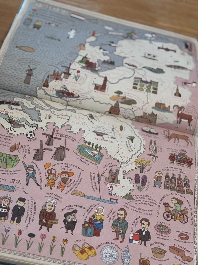 Aunque está recomendado para niños a partir de siete años, en realidad es uno de esos libros que crecen con el lector. Los más pequeños pueden pasar un buen rato simplemente mirando los dibujos, buscando animales, señalando detalles. Los mayores ya pueden leer los textos breves que acompañan a cada país, y los adultos… bueno, los adultos vamos aprendiendo igual o más que ellos. Es un libro que se disfruta en familia, sin edades. Cada vez que lo abres descubres algo nuevo.